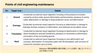 The following are the “Key Points for Civil Engineering Maintenance” presented in the guidelines from NEDO (New Energy and Industrial Technology Development Organization).